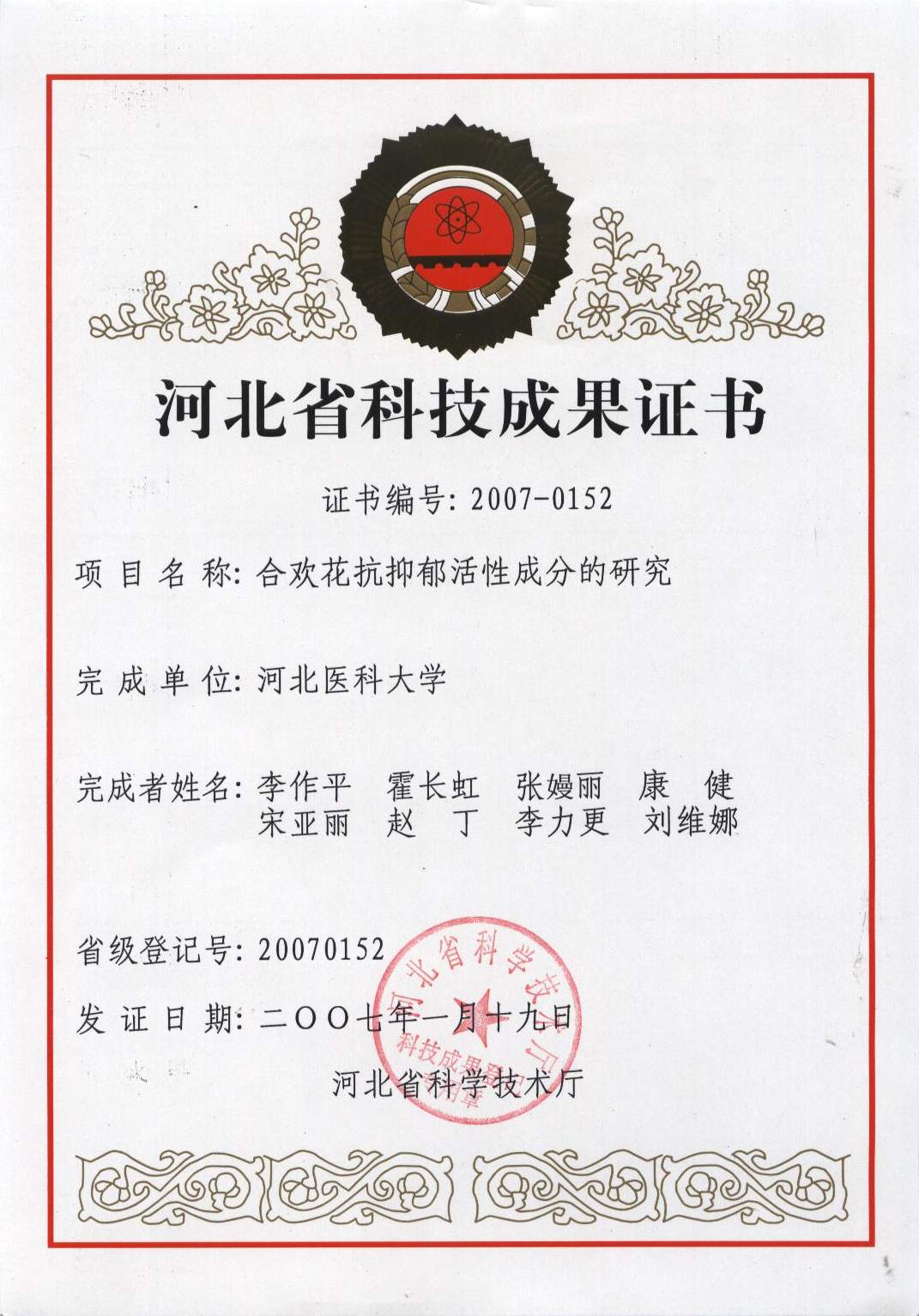 2007-01李作平主持的合欢花抗抑郁活性成分研究获省科