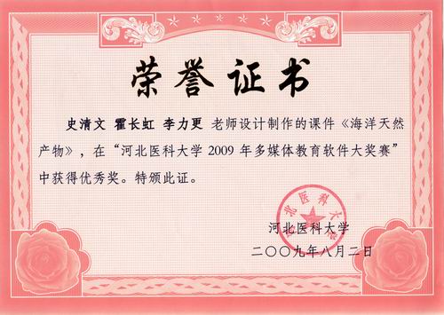 由我室教师史清文、霍长虹、李力更设计制作的教学课件《海洋天然产物》在好色tv 2009年多媒体教育教学软件大奖赛中获得优秀奖。