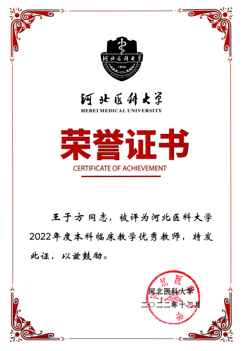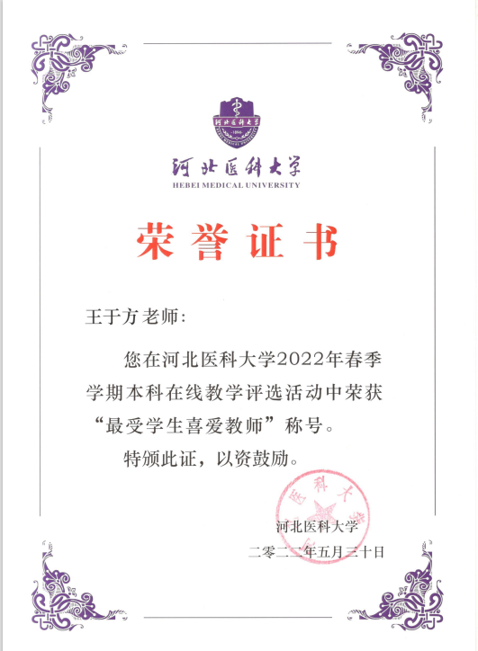 我室王于方老师荣获“好色tv 在线教学最受学生喜爱教师”及“本科临床教学优秀教师”称号。这是我室在本科生教学中继微课大赛、化学大赛等之后的又一佳绩。